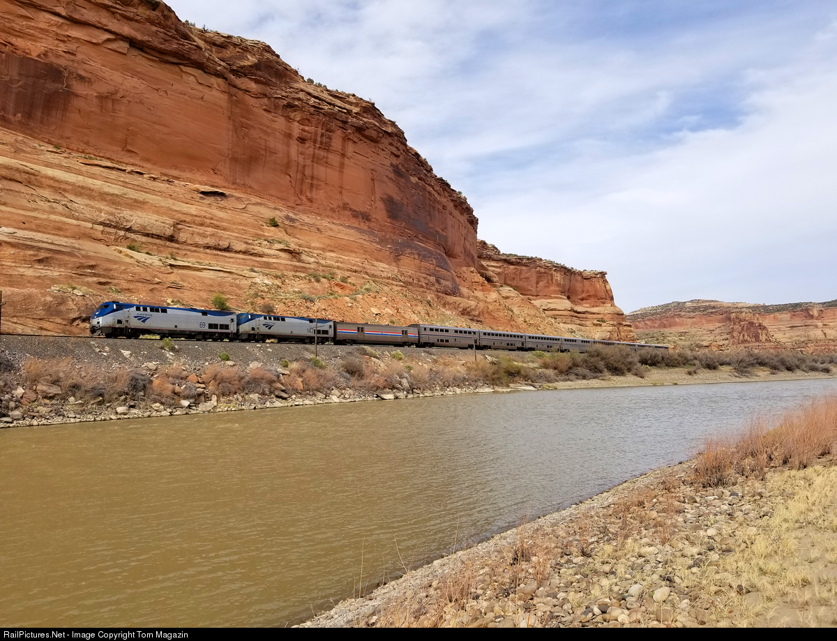 Beauty seldom seen! Amtrak train 5 breezes along the Colorado river in ruby canyon. Seen here between switches at Shale. This location is seldom seen due to difficult accessibility. This location can only be accessed by way of the Colorado river or by rail.