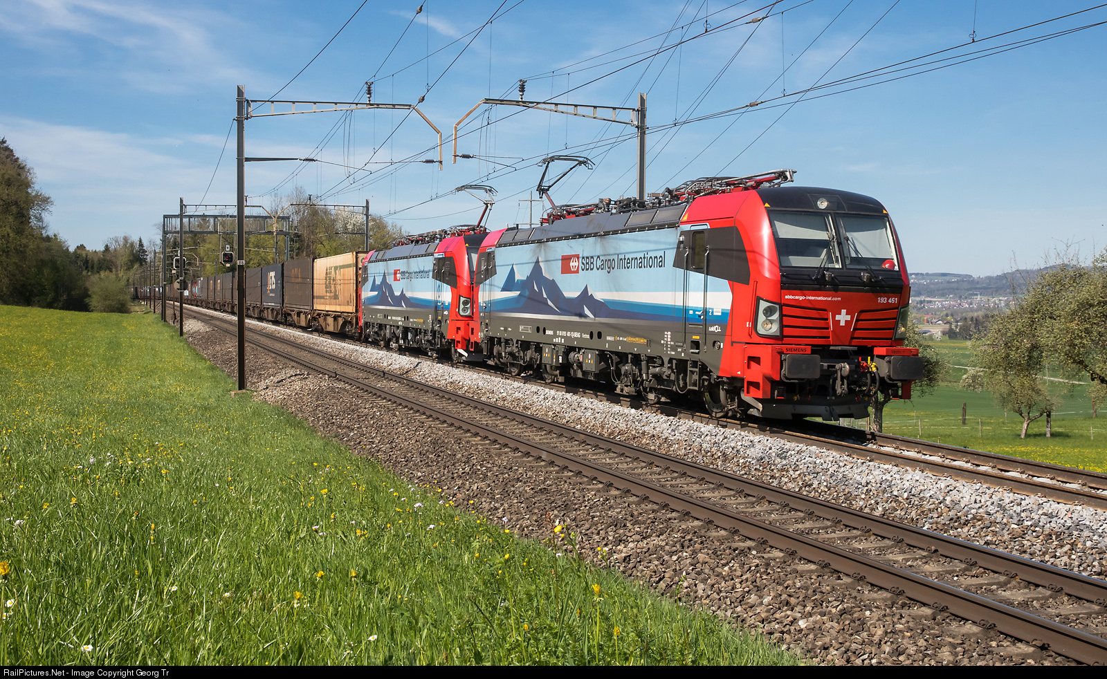 | New Siemens "Vectron" locomotives 193 # 461 "Olten" and # 470 "Freiburg" are pulling southbound intermodal train 40119 from Rotterdam Botlek/Netherlands to Milano Smistamento/Italy between Benzenschwil and Mühlau towards the Gotthard Base Tunnel. |