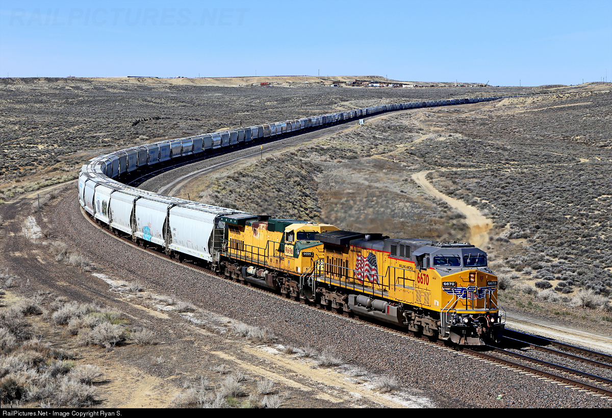 | Having topped the summit of Peru Hill an eastbound unit soda ash train carefully creeps down grade towards Green River with a compliment of over 100 'soda cans' tied to the drawbar. Trailing the head end consist is UP 9696 still wearing the road worn colors of the Chicago & Northwestern. The battle worn C44-9W reported for work for its prior owner in 1993 as C&NW 8632, today it is one of a ever dwindling few still wearing 'original' colors. |