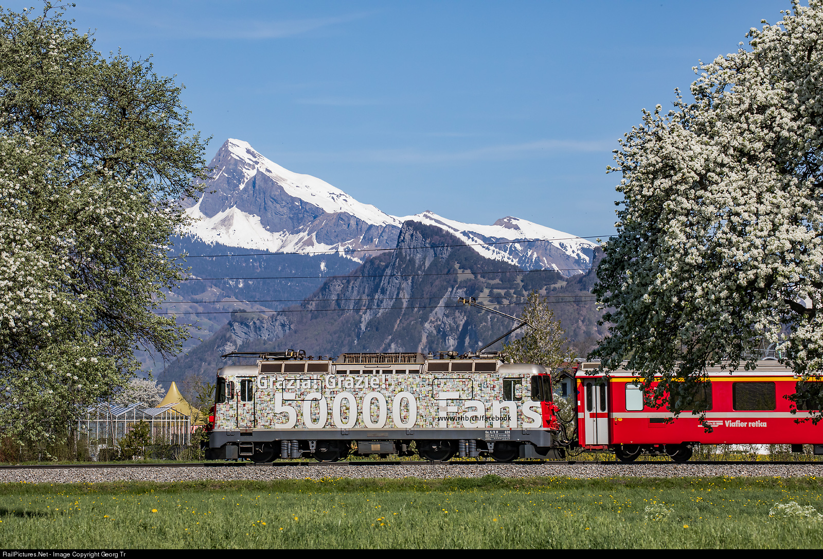 | Ge 4/4 II # 624 of the Rhaetian Railway with publicity paint scheme "Thank you 50000 followers on facebook" is pulling Regioexpress 1326 from St.Moritz via Vereina to Landquart near Malans, with 2310 meter high Gauschla. |