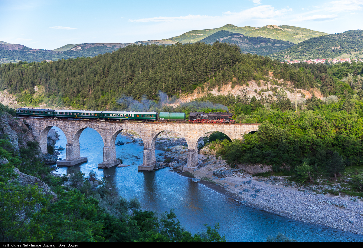 | BDZ "Mother Bear" steam locomotive 2-12-4T #46.03 with the "Corona express" and a tank car is crossing the bridge over the river Varbitsa between Kardzhali and Momchilgrad. There were only 20 steam engines with this wheel arrangement in Europe: 12 engines -including 46.03- were built by Cegielski in Poznan (Poland) in 1931 and 8 were built by Schwarzkopf in Berlin in 1943. They were originally designed to haul heavy coal trains on lines with steep gradients. 46.03 has been operational again since May 2015. |