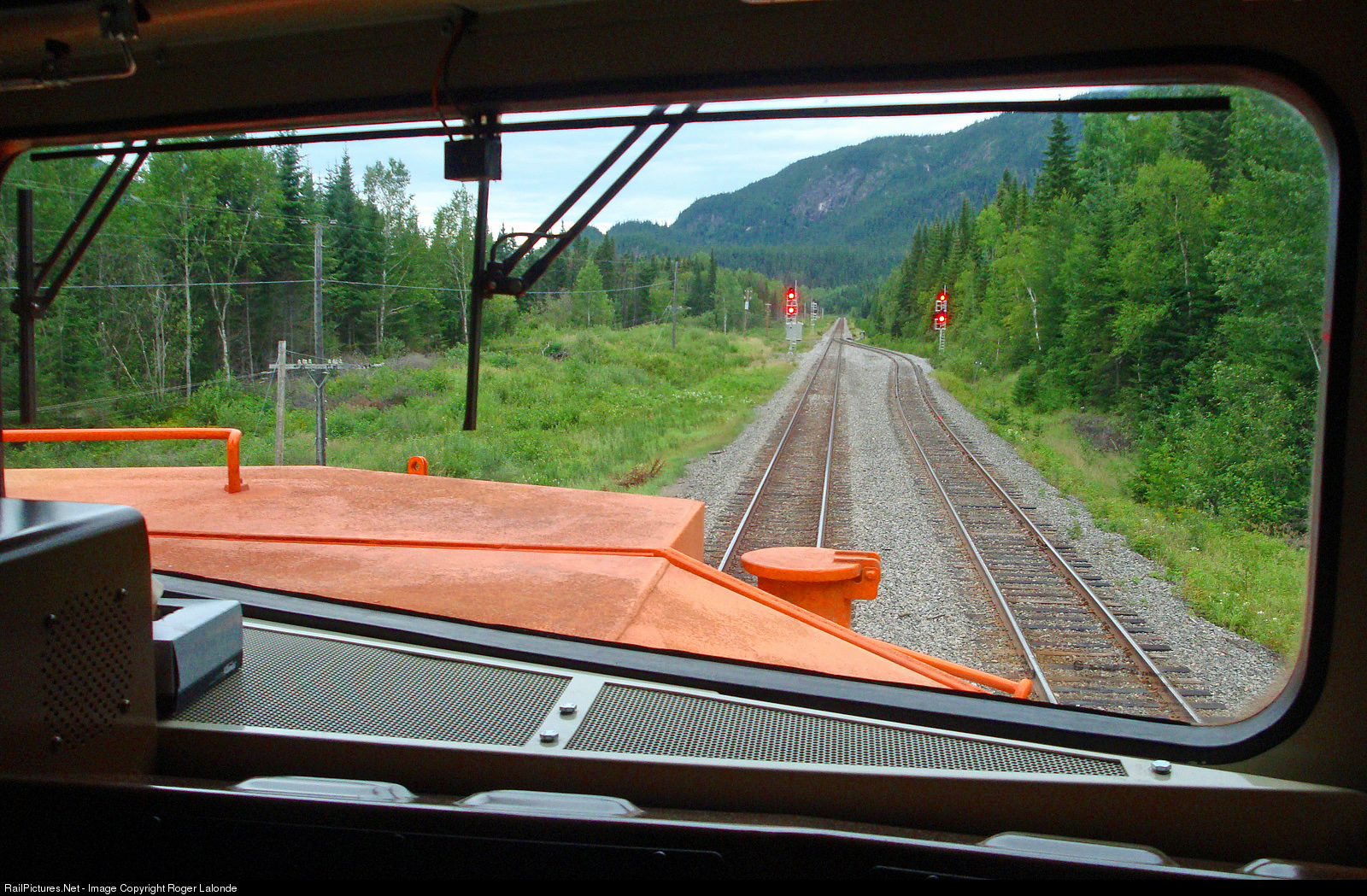 | QNS&L SD70ACe 501: Engineer's view of the northbound mainline, waiting for a meet at Nicman, Quebec mile 36.2 |