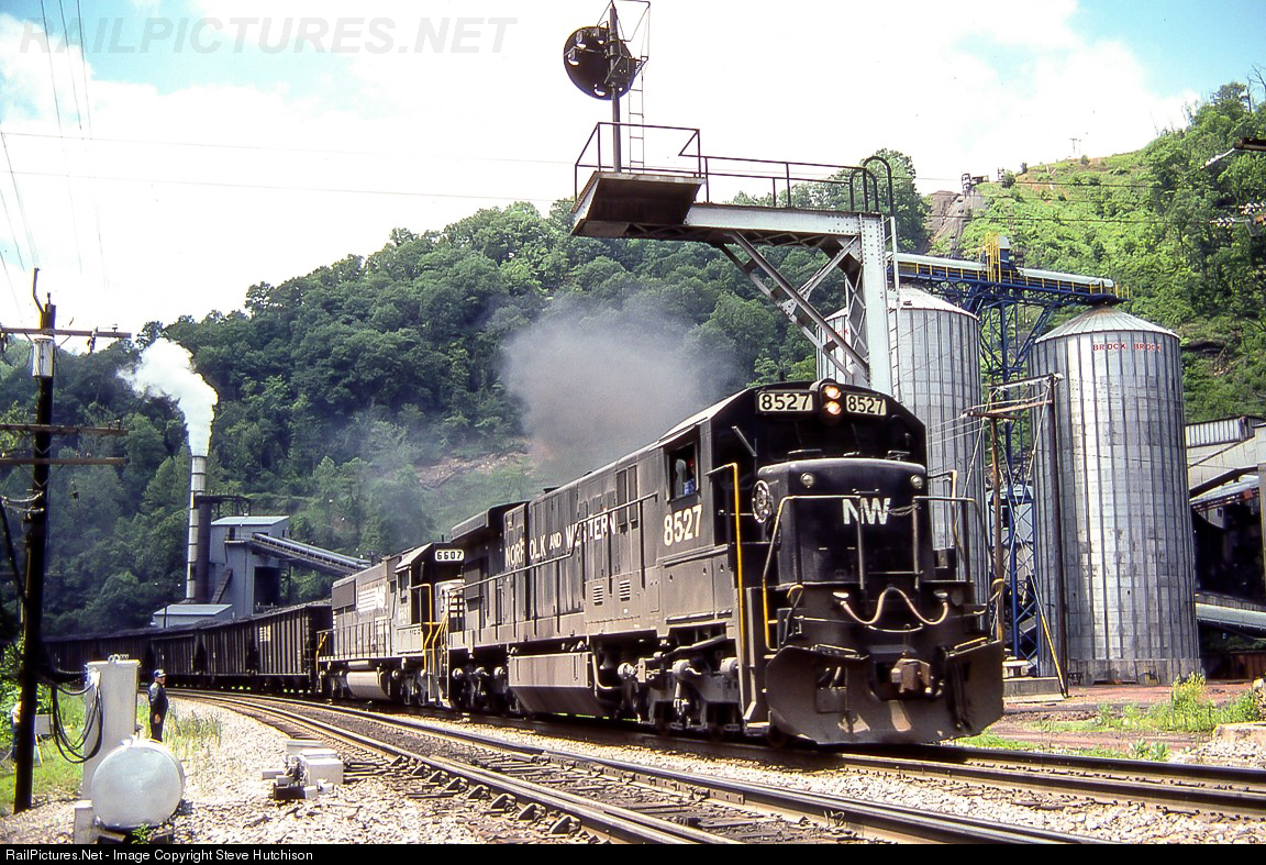 | An eastbound coal train, lead by C39-8E, 8527 and SD60, 6607, pass the coal processing plant at Keystone on the way to Bluefield. |