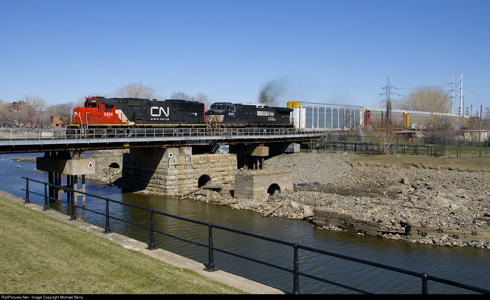 CN 5424 and smokey NS 9727 lead CN 401 over the Lachine Canal on a spring afternoon in Montreal (finally!). At the head end are loaded autoracks as always.