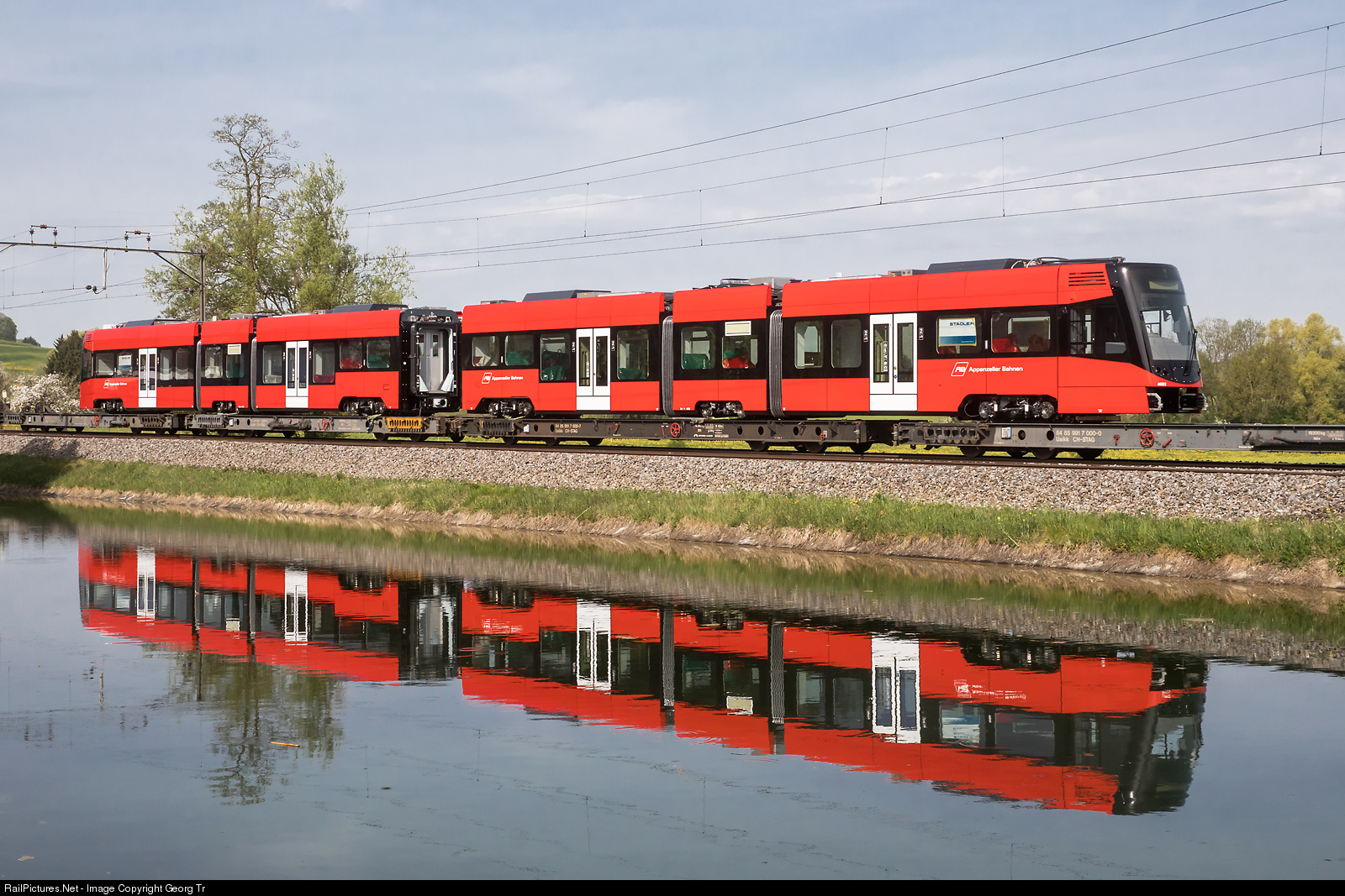The brand new 1 meter gauge "Tango" ABe 8/12 # 4002/4102 of the Appenzeller Bahnen is running along the pond at Riedt near Erlen, on 4 lowfloor transport cars Uaikk of Stadler Rail. The rail transport goes from the Bussnang work to Altenrhein, from were the vehicles will be sent on a lowfloor street transporter to Gais. On the mirror in the pond, the train seems to run on the standard gauge of the SBB (with battery power, no pantograph lifted?)