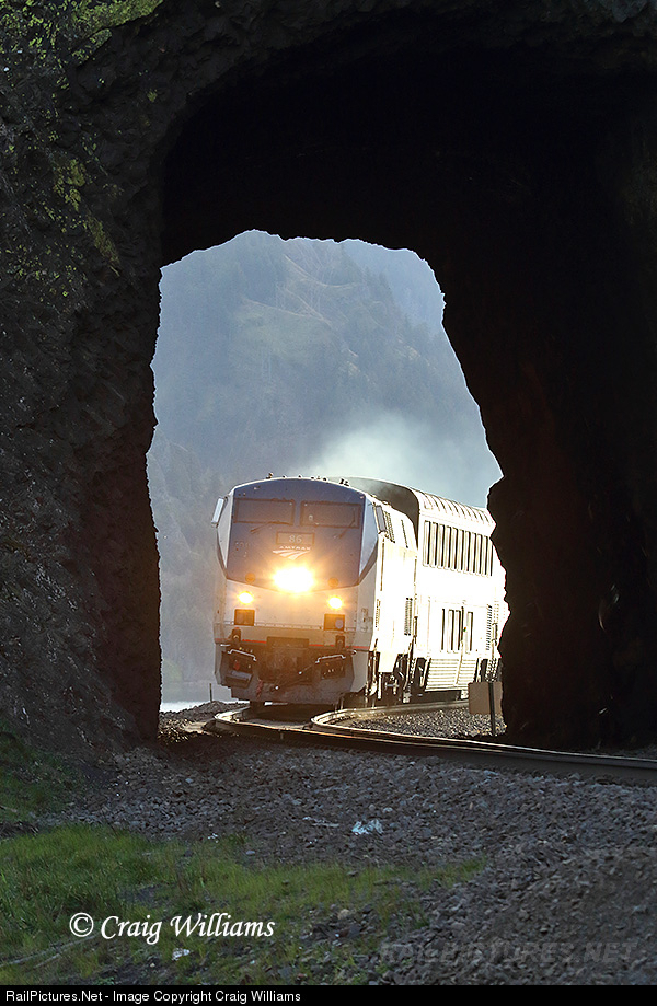 | My 1st day out in Oregon we had the afternoon free so we headed out into the Columbia River Gorge. Unfortunately the BNSF wasn't running much west. Towards sunset the only train moving was the Empire Builder heading east out of Portland. Train #28 is seen here passing thru the tunnel #1 along BNSF Fallbridge Sub west of Cook. |