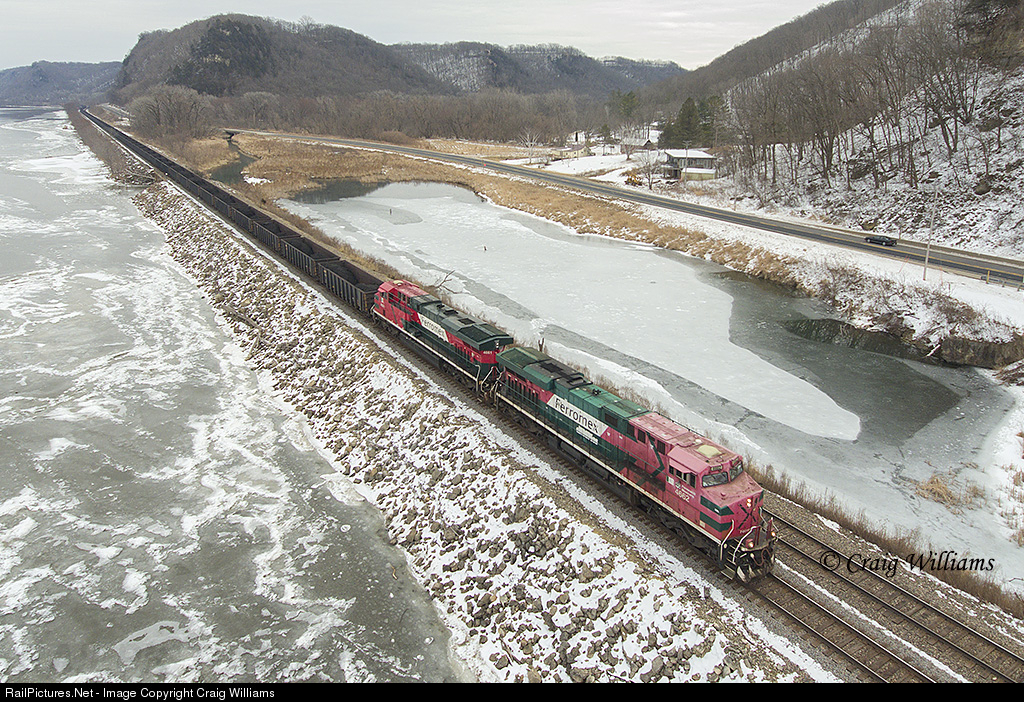 A nice surprise was this Kelly Lake, MN, to El Paso, TX, loaded ore train. Rumbling along the Mississippi River with 116 load of ore tailings and 2 BNSF GE's pushing on the rear end, this train passes the Lock and Dam 3 mile south of Lynxville. With PTC in full swing on the BNSF, seeing odd ball foreign leaders is starting to be alittle less common.