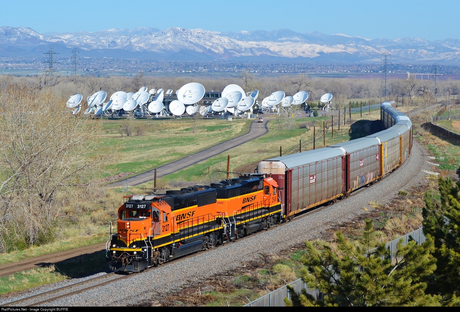 | BNSF 3127 (GP50) pulls a string of autoracks past a satellite facility for Comcast Cable in Douglas County, north of Sedalia, Colorado. |