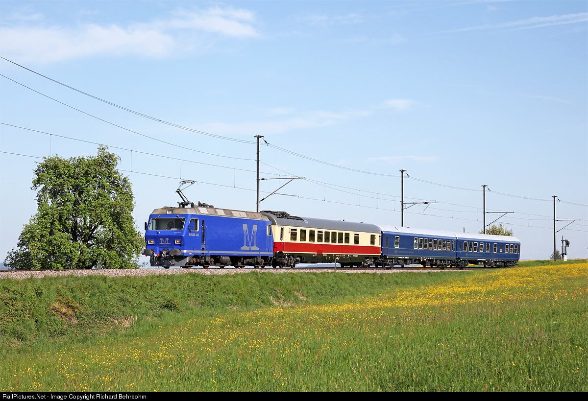 Re 456 111 of Müller Gleisbau (M-Rail AG) heads a charter train with three dining cars.