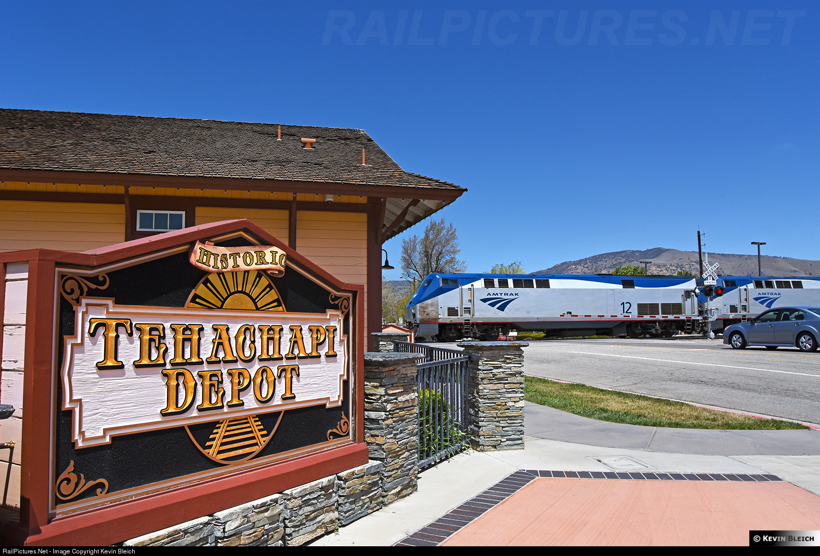 | Northbound Coast Starlight train 14 makes a rare appearance passing the Tehachapi Depot in downtown Tehachapi. Due to MOW work on its regular route along the Pacific coast, the Coast Starlight was detoured through Tehachapi Pass, which now only sees a passenger train on the very limited occasions when the Starlight is rerouted. |