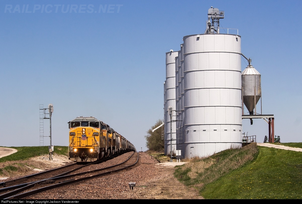 UP GSHDNA, a southbound grain train, gets back on the move out of Block after waiting for a track inspector. This train will once again ease to a halt just north of Villa Grove at "Garbage Dump Road," where the inbound crew will await their outbound. Leading the way is UP 2412, an SD60M, and in third is a UP SD9043MAC, number 3750. Both of these units have recently been pulled from storage to assist in large freight volume.