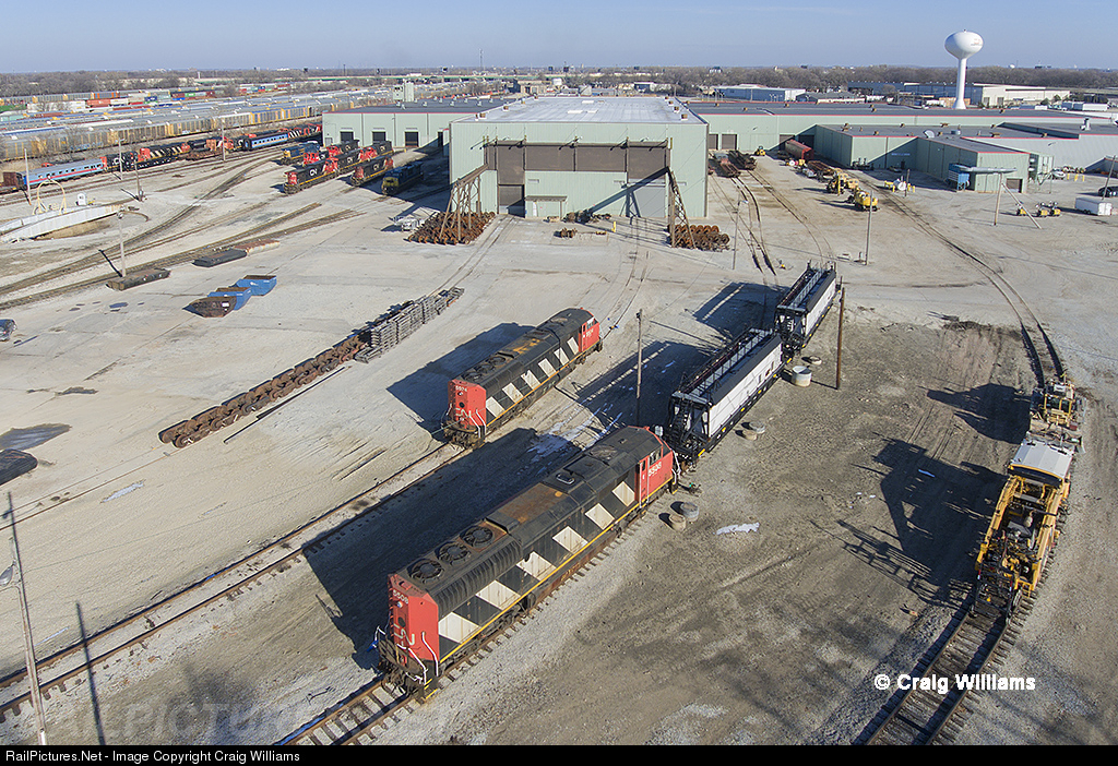 A bird-eyes view around the CN Woodcrest Shops. There is a deadline of SD60's north of the shops, but these 2 units are sitting out back. Also the natural gas flat cars are here OOS. Lots of power coming and going as this is CN's main shops in the US. Some of the SD60Fs recently were sold to the Aberdeen Canton and Western. Photo: Taken over CN property by CN employee.