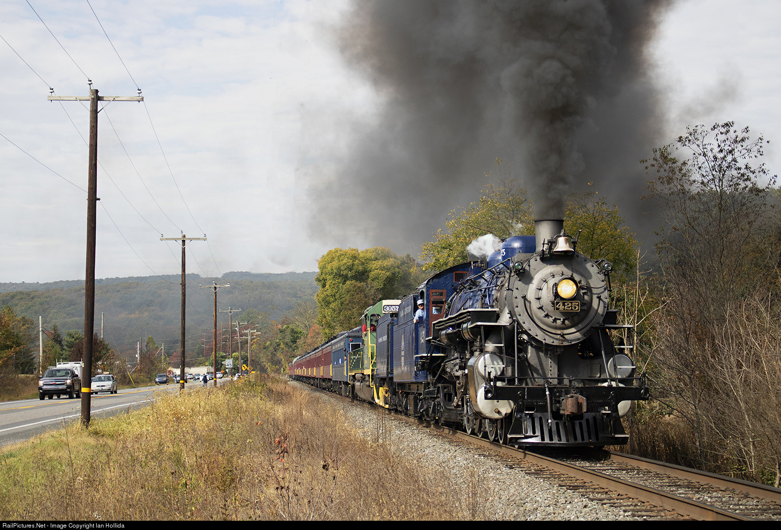 | With a 15 car train full of tourists and railfans alike in tow, Reading and Northern 425 highballs towards Jim Thorpe with engineer Shane Frederickson keeping an eye on the line ahead. |