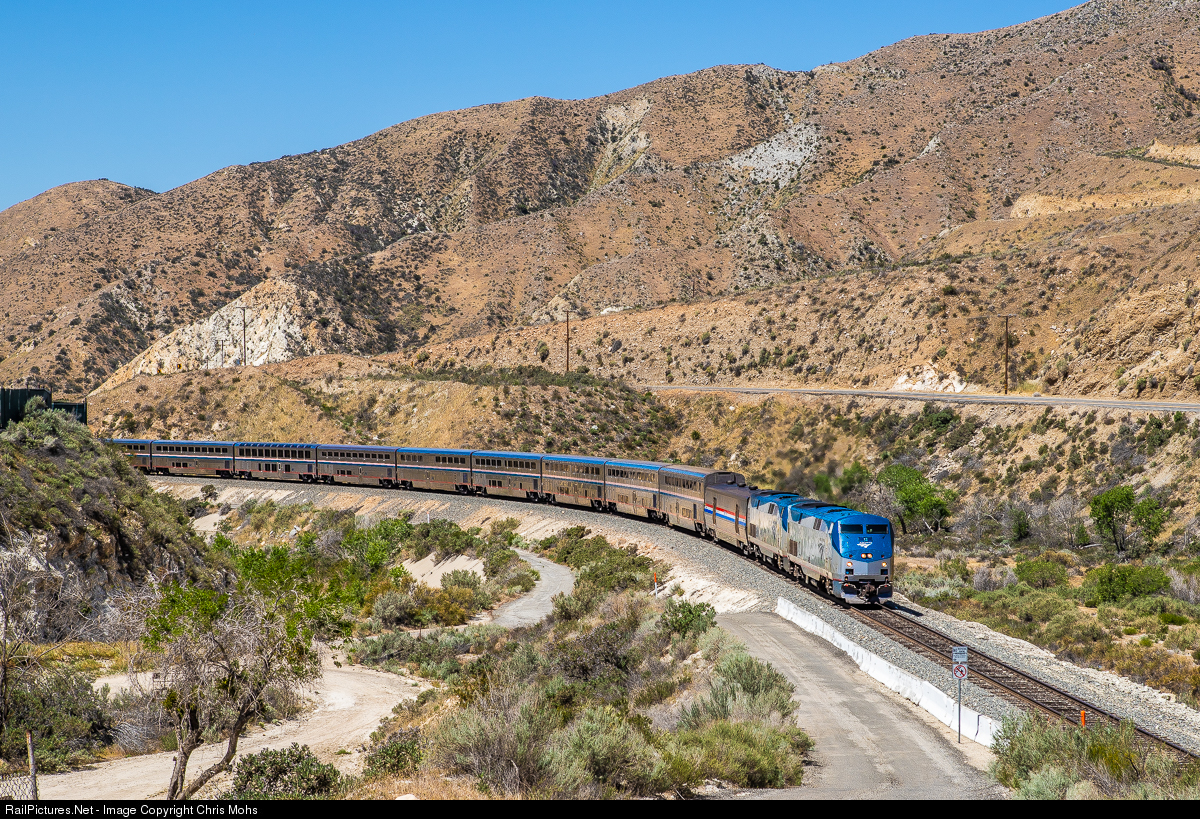 | Detouring off the Coast Route due to Tunnel work being done in the Chatsworth area, Amtrak No. 14 the northbound Coast Starlight, heads up Soledad Canyon. The route will take the train up and over Tehachapi Pass, up the Fresno Sub to Altamont Pass and over to Oakland where it will resume its normal route. |