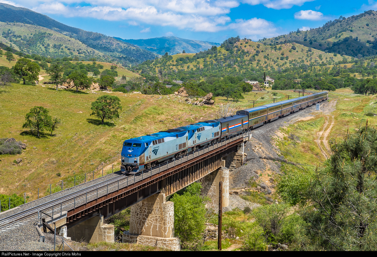 | Detouring off the Coast Route due to Tunnel work being done in the Chatsworth area, Amtrak No. 14 the northbound Coast Starlight, crosses over Tweedy Creek after passing through Keene on the western side of the Tehachapi Mountains. No. 14 will continue to Bakersfield and travel up the Fresno Sub and over to Altamont Pass and on to Oakland where it will resume its normal route. |