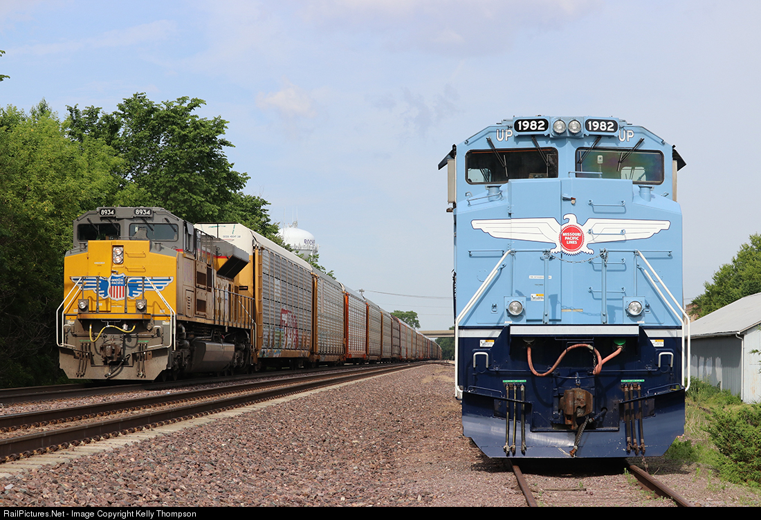 UP 1982 sits on display for Rochelle Railroad Days 2017 as a UP SD70ACe passes. Photo was taken with permission from the UP employee watching the unit.