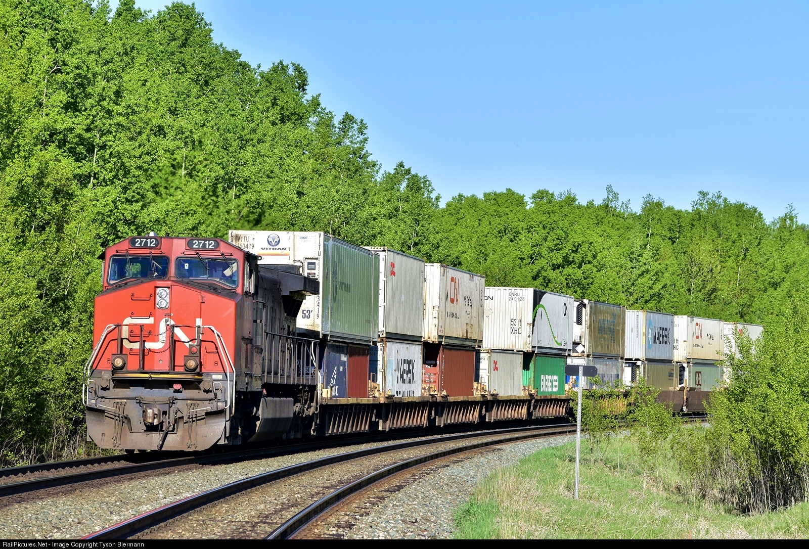 | IC C44-9W 2712 pushes the rear of Q111 (Toronto, ON - Vancouver, BC) westbound at Carvel, Alberta. |