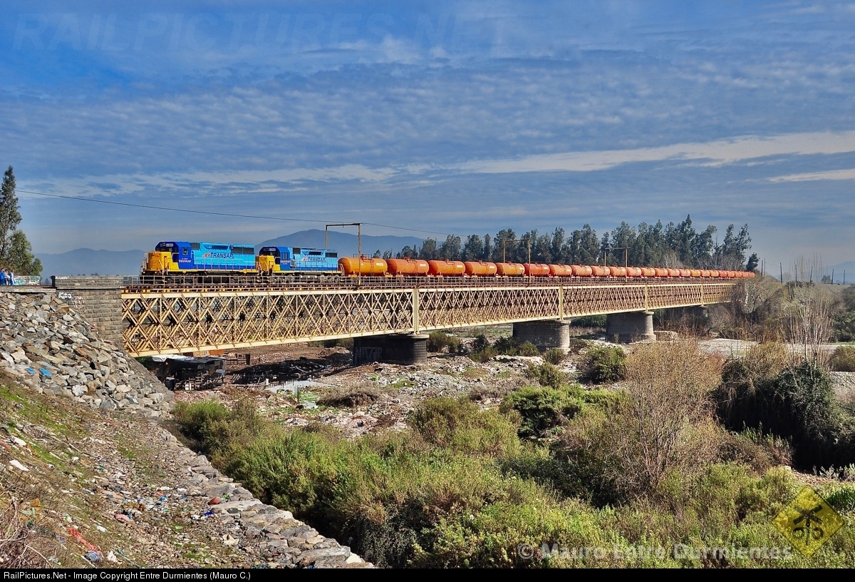 | Over the Mapocho river (that no longer carries so much water), freight train of TRANSAP railway crosses this railroad bridge near Talagante city, on route Barrancas (San Antonio) - Los Lirios (near Rancagua city), loaded with sulfuric acid for export to great copper mines of northern Chile. Leads the train EMD rebuilt SD50 No. D-3501, former Union Pacific EMD GP50. Second locomotive EMD rebuilt SD39-3M. |