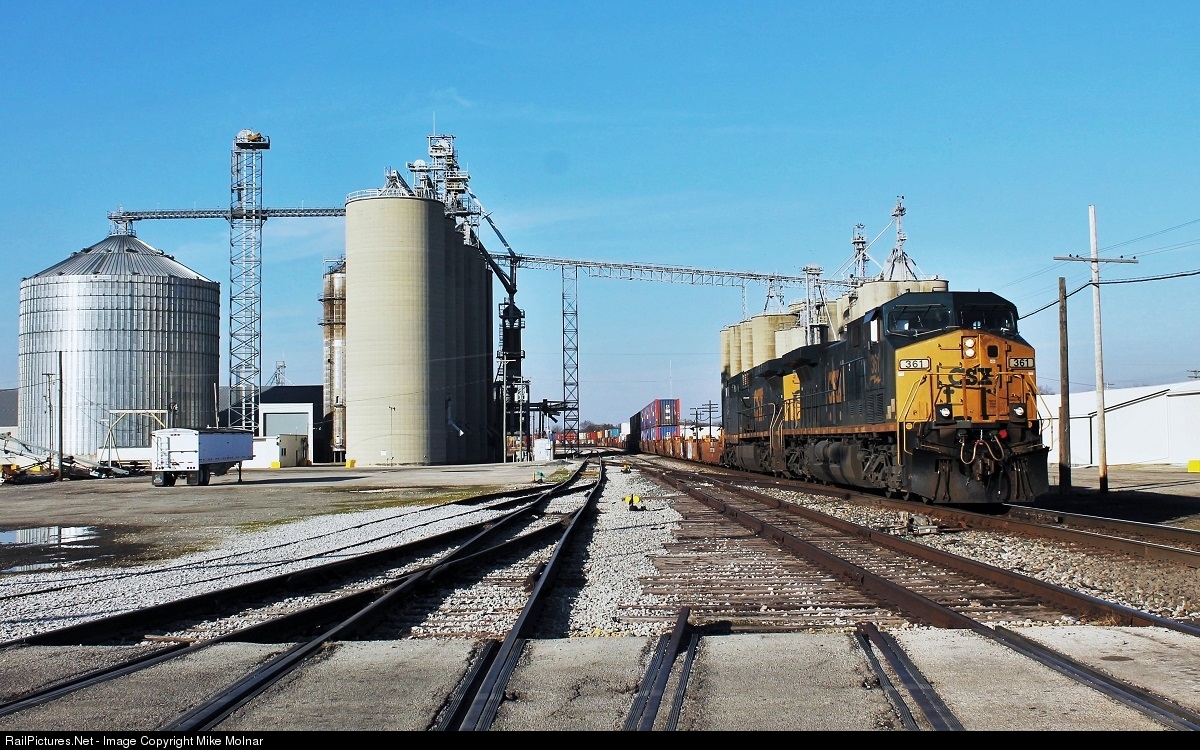 A southbound CSX intermodal passes the large grain co-op in Upper Sandusky, Ohio on the CSX Columbus Subdivision.