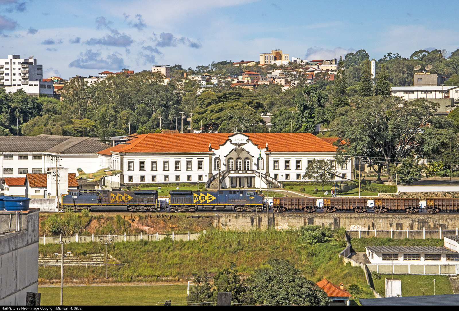 | Empty ore train passing in front of EPCAR "Preparatory School of Air Cadets". The Preparatory School of Air Cadets is a military institution of high school, with the mission to prepare the Students to enter the Course of Aviators Officers through the Preparatory Course of Air Cadets (CPCAR). |