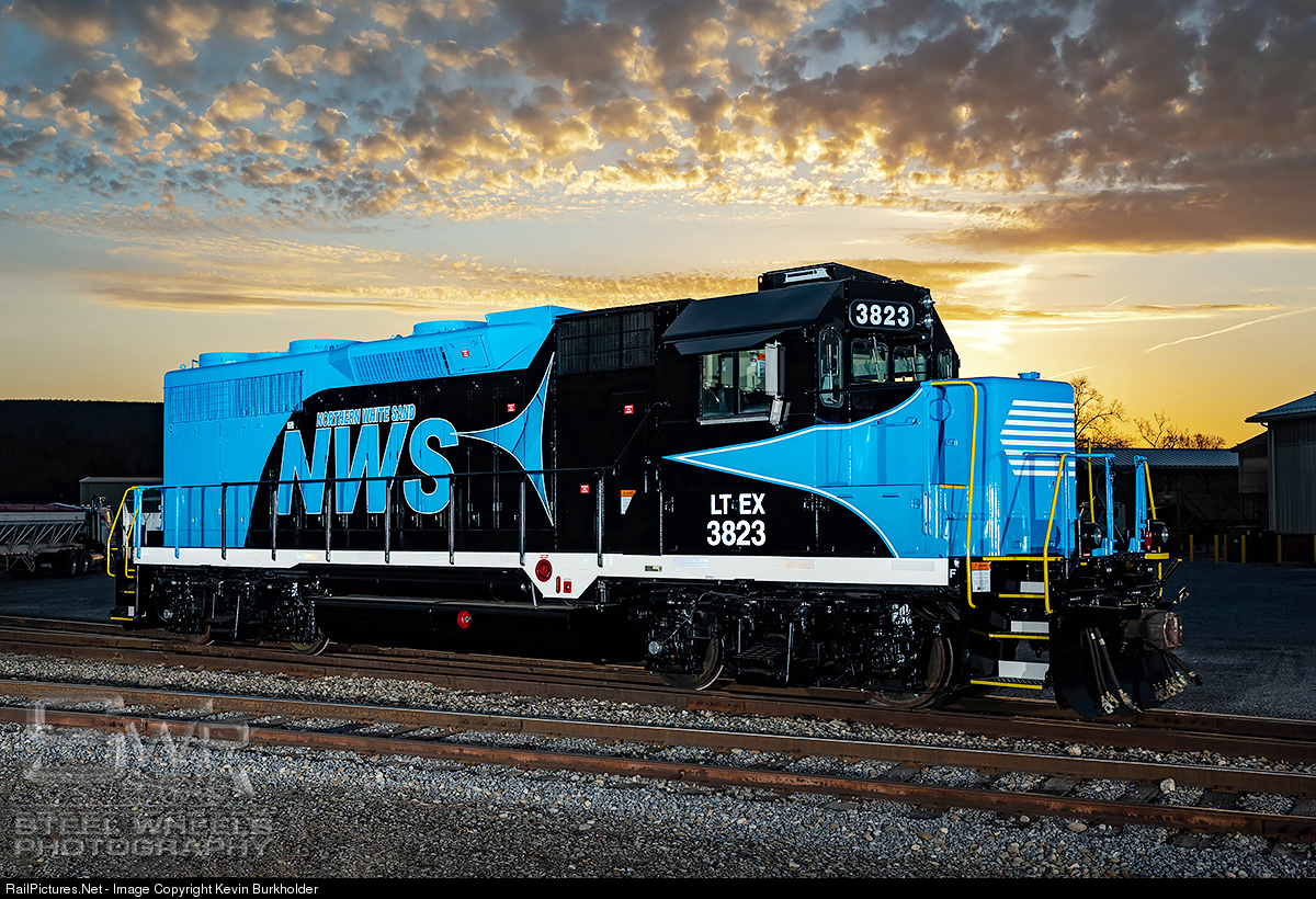 Introducing the newest American Motive Power Inc. GP38M-3 remanufactured locomotive, LTEX 3823. Rebuilt from the frame up using base model LTEX GP35u 2574, the LTEX 3823 has an all new prime mover and components, as well as an autostart system that AMP has been installing. The 3823 is painted for the Northern White Sands Railway, a new industrial line that will be based out of Peru, Illinois later this summer. It was originally constructed as ATSF GP35 1374 in 1965 and later became ATSF 3374, before being rebuilt to GP35u and number ATSF 2874. It would later become BNSF 2574 and eventually LTEX 2574, before being remanufactured. Photo is within the confines of the American Motive Power Inc. facilities on May 1, 2018. It is slated to ship west on CSXT within the next week or two.