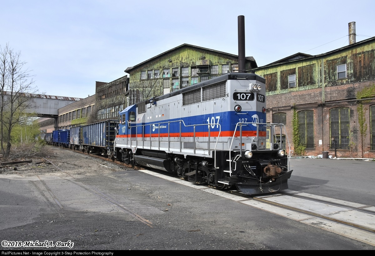 | Metro-North GP35R 107 running long hood forward, brings a work extra south, passing the old Farrels factory in Ansonia. |