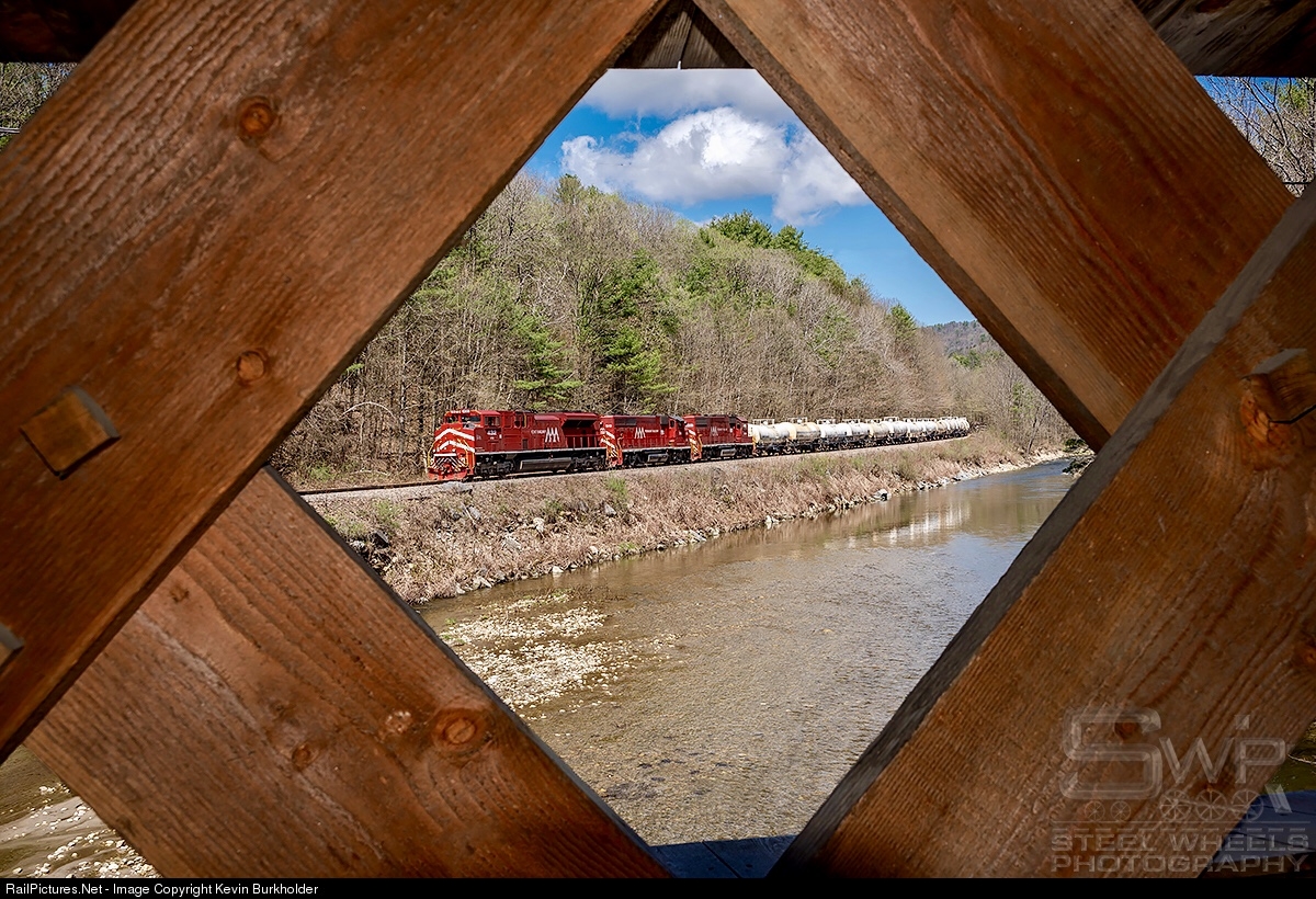On May 5, Vermont Rail System's weekly slurry train featured a matched Vermont Railway trio of motive power, including three different EMD models, VTR SD70M-2 432, VTR GP40-2W 310 and VTR GP38-2 201. Sometimes composing a single scene can provide a challenge and with the new higher speeds on the GMRC, there’s not much time for a last minute decision. Once I put the drone into position for the overhead shot, I grabbed the DSLR for a framed image inside of the Bartonsville Covered Bridge.