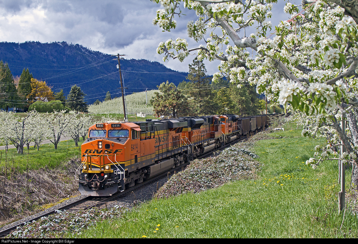 | BNSF 6414 eases coal empties eastbound through orchards near Peshastin, WA about a half hour west of its next crew change at Wenatchee. Blossoms were in peak bloom on April 28 this spring. |