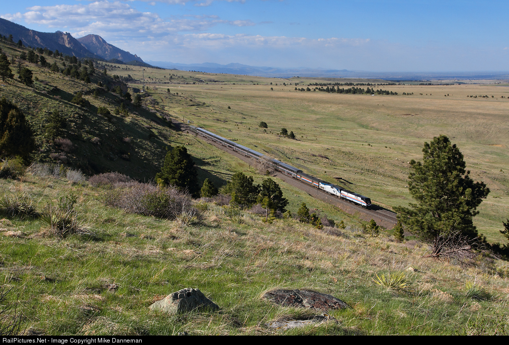 With some recent moisture, even the grasses on the front range mountains have started to turn green. On the afternoon of May 4, 2018, Amtrak’s eastbound California Zephyr descends the trackage through Eisele (formerly Clay), Colorado. Leading the train is recently-repainted P42DC No. 130.