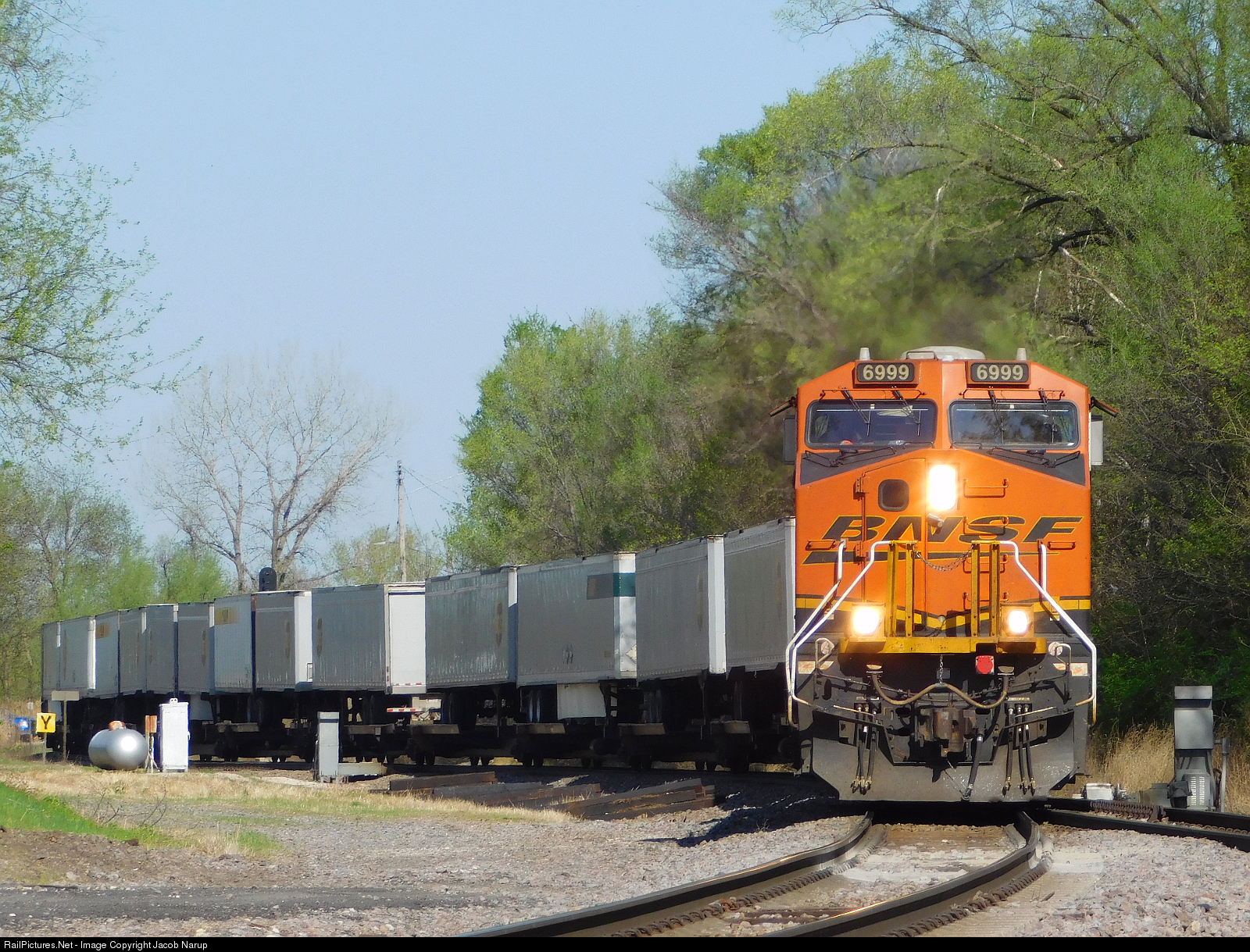 BNSF 6999 leads a baretable train over the interlocking at Colona.