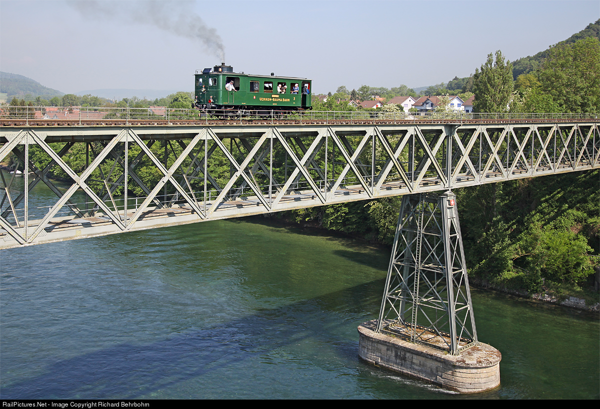 | Steam railcar CZm 1/2 31 of the former Uerikon-Bauma-Bahn, constructed in 1932, is crossing the Rhine Bridge Etzwilen - Hemishofen. |