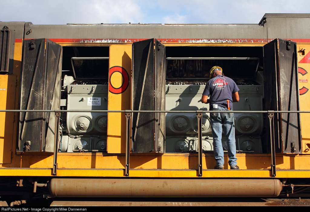 A worker at Union Pacific’s Downing B. Jenks Shop at North Little Rock, Arkansas, makes a thorough inspection of an EMD SD70M, writing up any defects and other work that needs to be done before the locomotive heads into the shop for repairs on May 19, 2015.