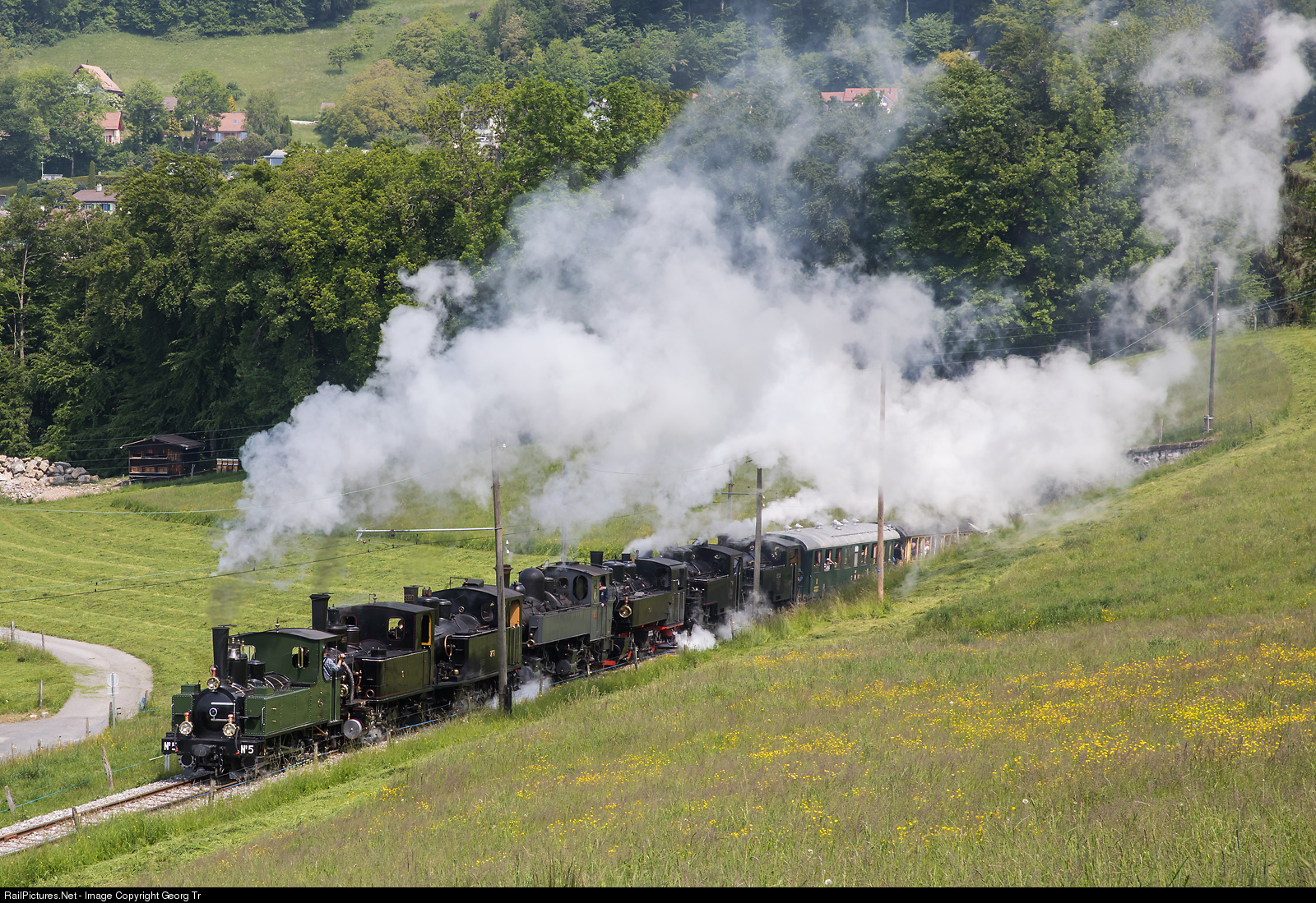 The Blonay-Chamby Railroad Museum is celebrating 50 years of service, it was the first museum railway of Switzerland. A train with 7 steamlocomotives (4 from the BC and 3 guests) are pulling a 7 car train from Blonay to Chamby and the Chaulin museum, near the stop of Cornaux, during the MEGA STEAM festival on the pentecost weekend. Leading is G 3/3 # 5 "Bercher" ex Lausanne-Echallens-Bercher, followed by G 3/3 # 6 ex Bière-Apples-Morges, G 3/4 # 208 of the Ballenberg Dampfbahn (guest), G 2x2/2 E # 164 of La Traction (guest), G 2x2/2 # 105 ex Zell-Todtnau, cogwheel HG 3/4 # 4 of the Dampfbahn Furka Bergstrecke (guest) and HG 3/4 # 3 ex Furka-Oberalp-Bahn.