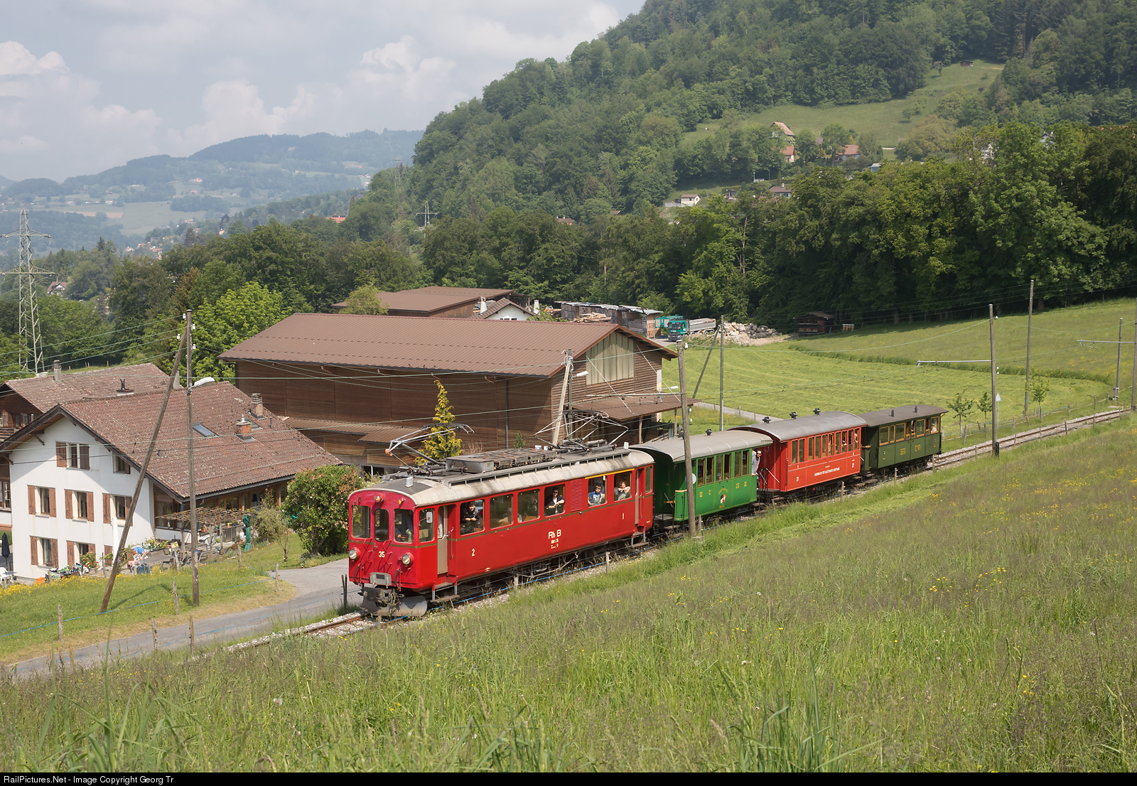 The Blonay-Chamby Railroad Museum is celebrating 50 years of service, it was the first museum railway of Switzerland. Electric railcar BCe 4/4 # 35 from 1909, which came from the Bernina line of the Rhaetian Railway to the Blonay-Chamby in 2010, is pulling a passenger train from Blonay to Chamby and Chaulin museum, near the stop of Cornaux. This was one of the very few electric trains this day, because on the occasion of the MEGA STEAM festival with 10 steamlocomotives, there was more then enough steam traction available.