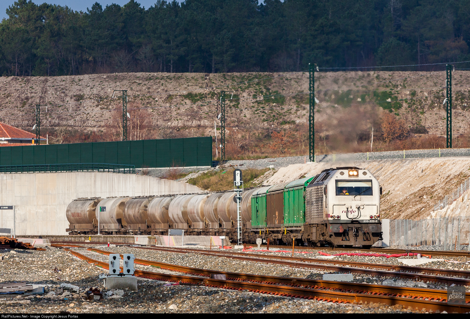 333.320 gives the power to an empty cement train as it passes O Irixo station.