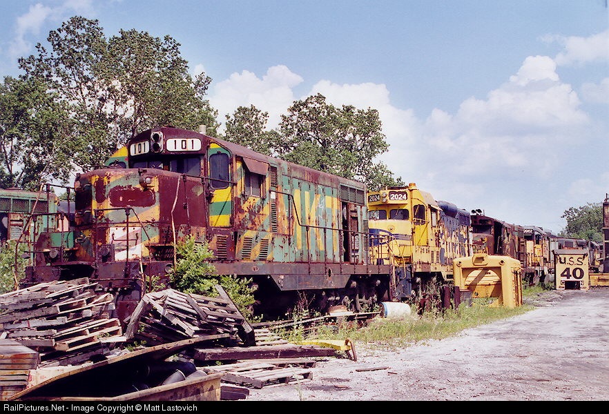 | Located at the back of NRE in Dixmoor you can find quite an array of power starting with MKT 101, ATSF 2024, MKT 100, & UP 9962. |