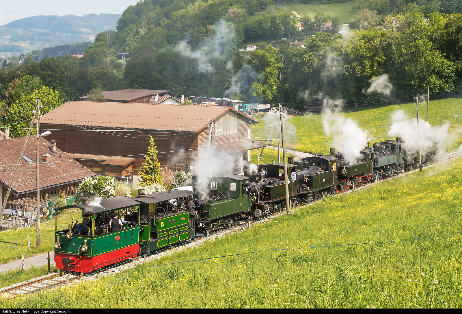 The Blonay-Chamby Railroad/Museum is celebrating the 50th anniversary in 2018. Part of the celebrations are 5 guest steamlocomotives. On this day, 4 of the guest locomotives together with the 5 operational steamlocomotives of the Blonay-Chamby, are forming one long train with 9 coupled steamlocomotives on 1 meter gauge, unique in Europe in 2018. From left to right: tramway locomotive G 2/2 # 4 "Rimini" (BC), 0-6-0 tramway locomotive # 60 "La Ferté-Bernard" (guest), G 3/3 # 5 of the LEB (BC), G 3/3 # 6 of the BAM (BC), G 3/4 # 208 of Ballenberg Dampfbahn BDB (guest), G 2x2/2 # 105 ex SEG (BC), G 2x2/2 E # 164 of La Traction (guest), HG 3/4 # 4 of the Dampfbahn Furka Bergstrecke DFB (guest) and HG 3/4 # 3 former BFD (BC).