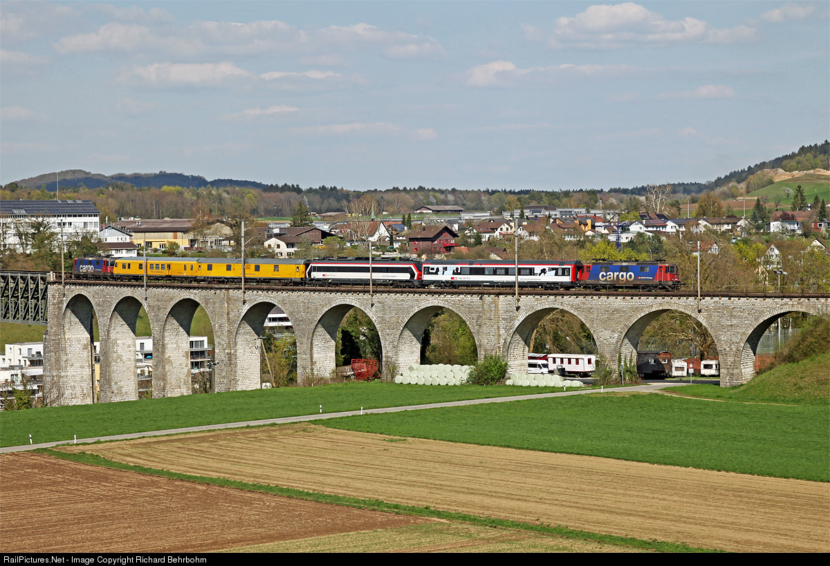 | A push-pull mixed German/Swiss measuring track train with SBB-Cargo locomotives at the end of the train. The yellow cars are owned by Deutsche Bahn, the SBB one are white colored. |