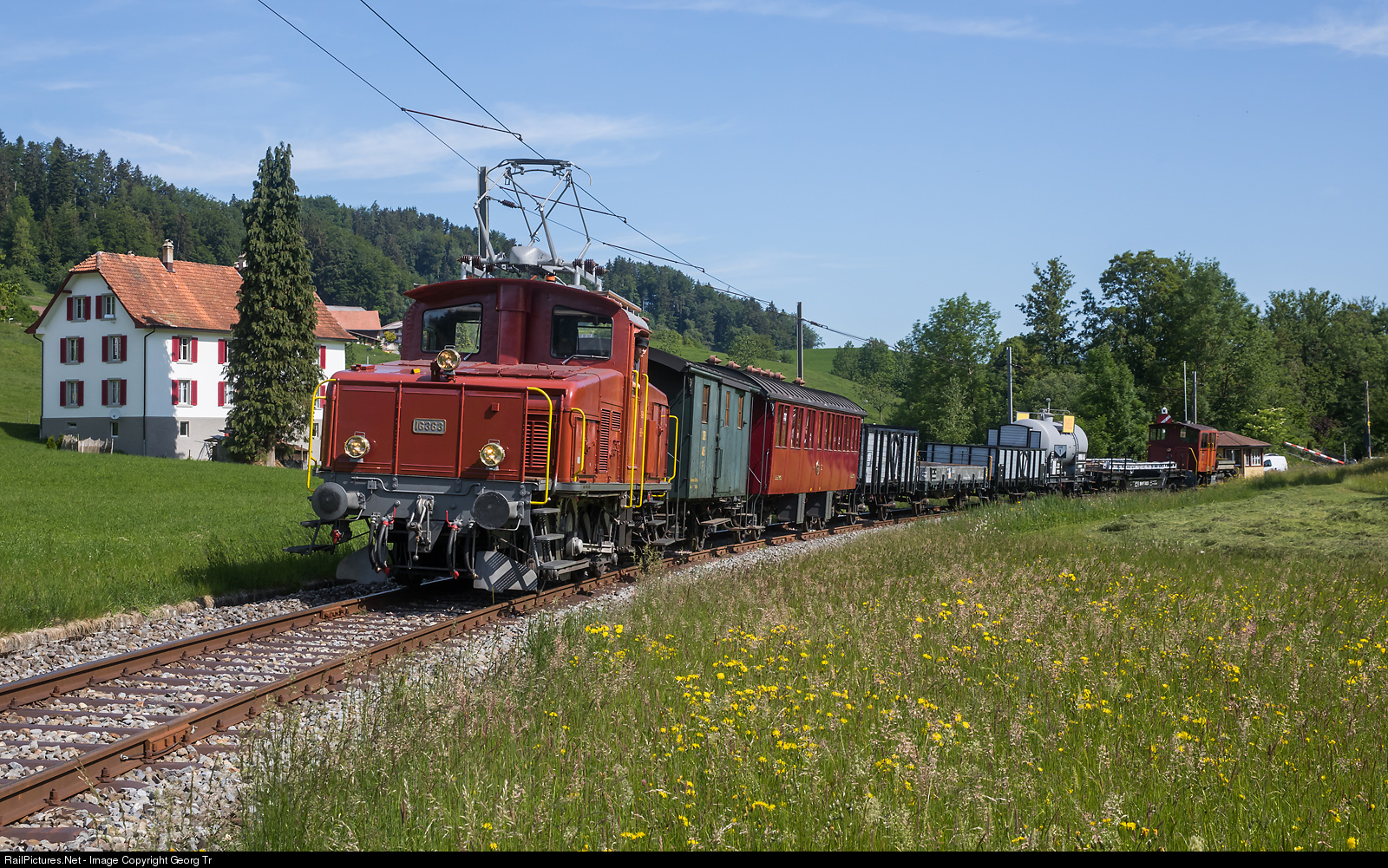 | Former SBB shunting locomotive Ee 3/3 # 16363 of Dampfbahnverein Zürcher Oberland is pulling a mixed passenger/freight train from Bauma to Hinwil, leaving Neuthal. The locomotive was built in 1939 and is running for the DVZO since 2011. |
