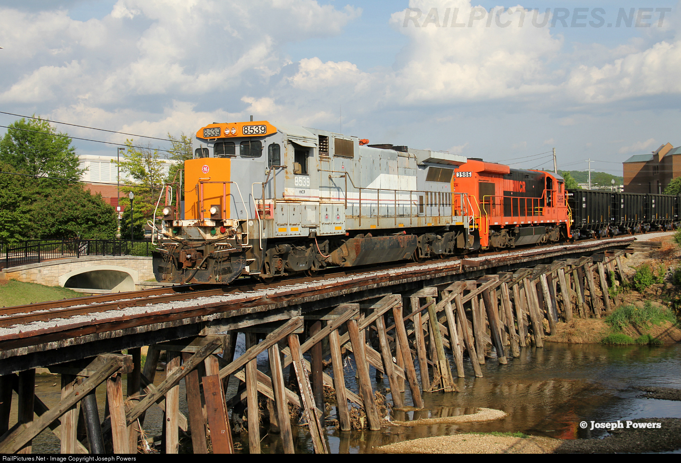 Huntsville and Madison County Railroad Authority B39-8 8539 and B23-7 3986 lead a train of gondolas north across Pinhook Creek in downtown Huntsville, AL.