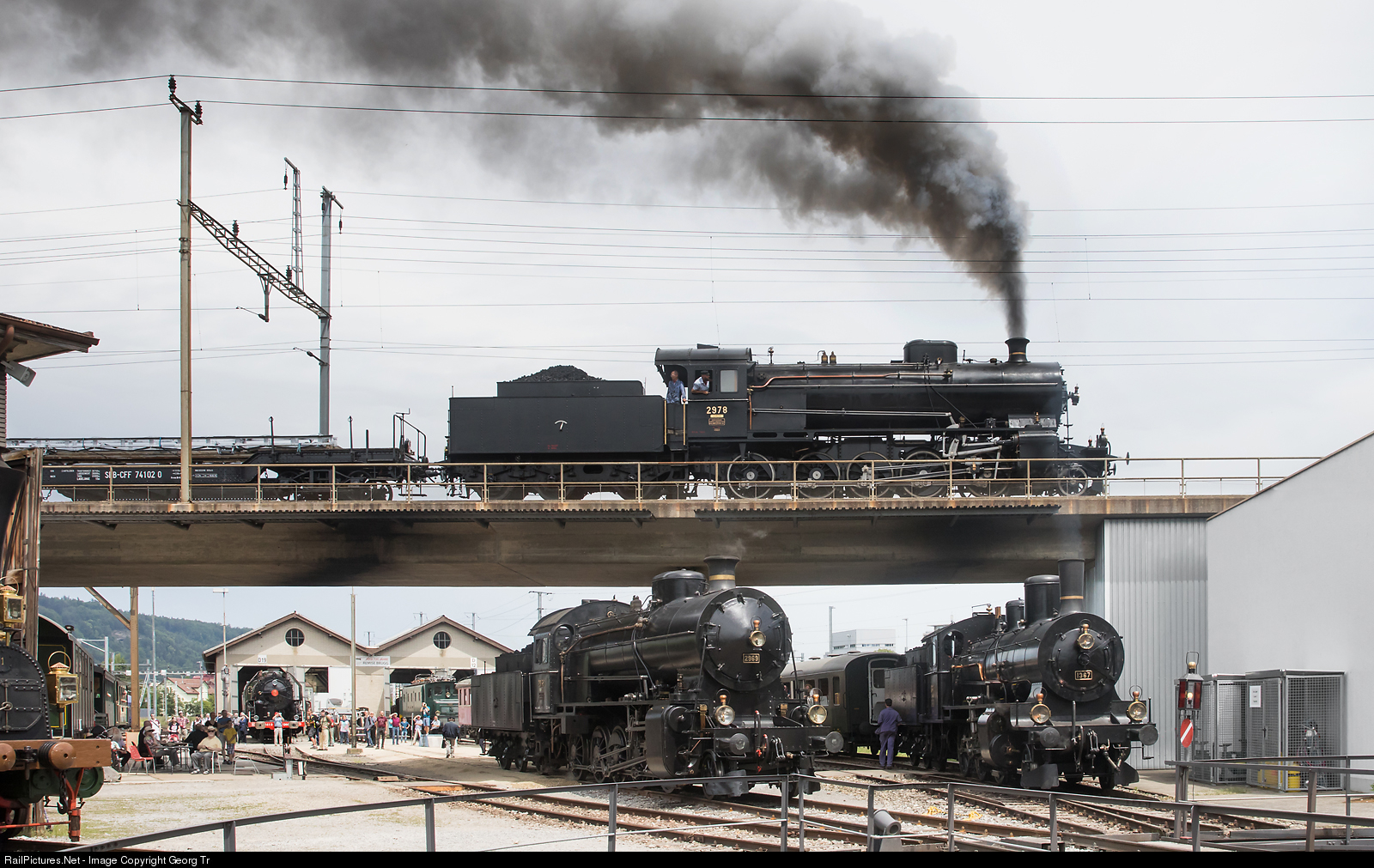 On the occasion of the open doors event in the Bahnpark Brugg (AG), this nice scene could be seen: "Elephant" C 5/6 # 2969 of Eurovapor Sulgen and B 3/4 # 1367 of SBB Historic are standing in the shed area, while "Elephant" C 5/6 # 2978 from SBB Historic is running with a freight train full speed over the bridge.