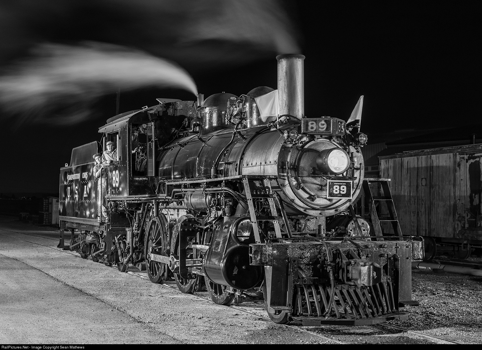 Strasburg Railroad 89, Dressed as a Transportation Corps engine, sits idle for some photos after a Lerro Photography charity charter. The engineers are dressed in period military clothing.