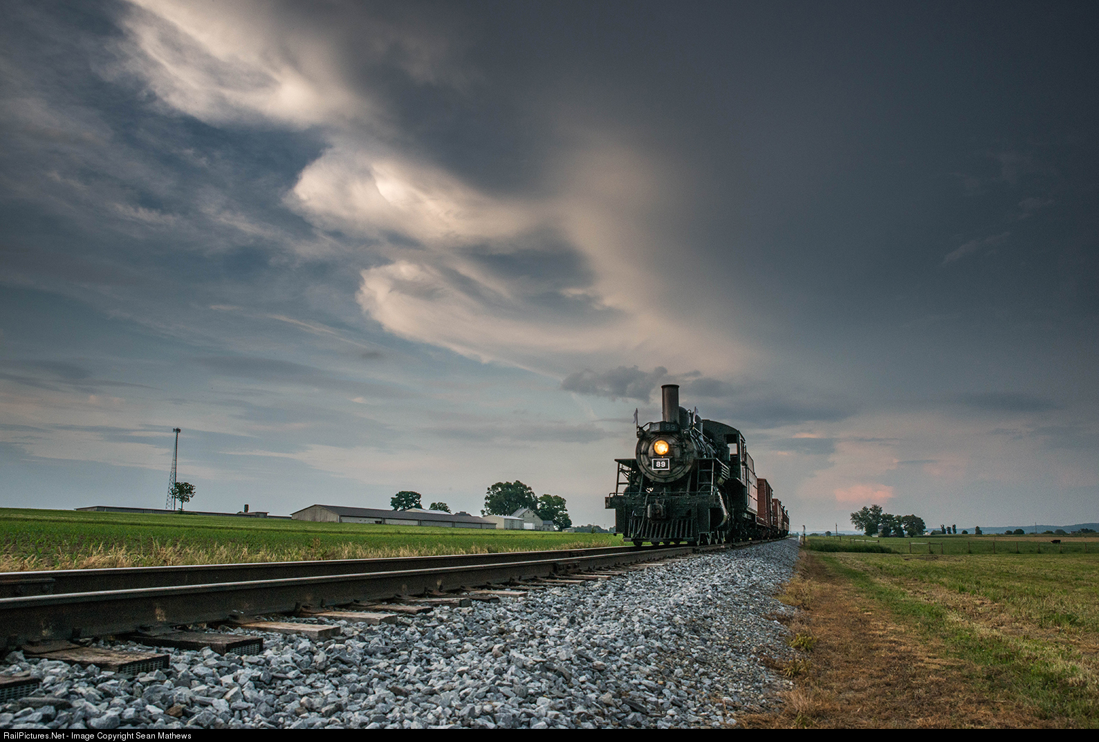 With the threat of severe storms in the area, some of which were overtaking the sun, Strasburg #89 makes its final pass for a throng of photographers who signed up for a Lerro Photography charity charter. Fate would smile on us, as the storms disspated and parted before reaching us while we prepped for the night shoot.