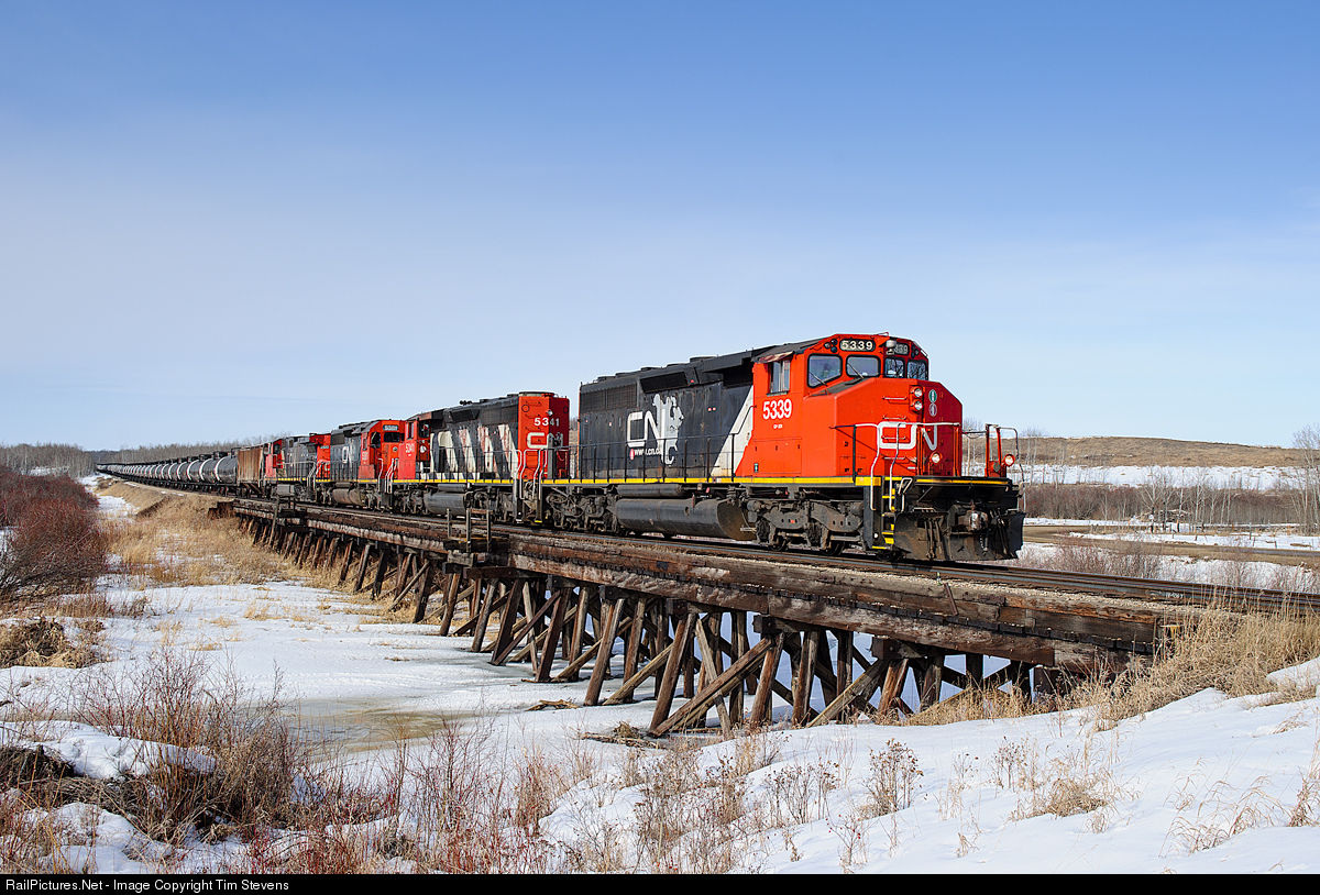 | CN SD40-2Ws 5339 and 5341 join sister SD40-2 5381 and C44-9WL 2522 leading 100 loads (plus two buffers) of Reybold, DE bound sour crude oil south on the Coronado Sub crossing a small wooden trestle. |