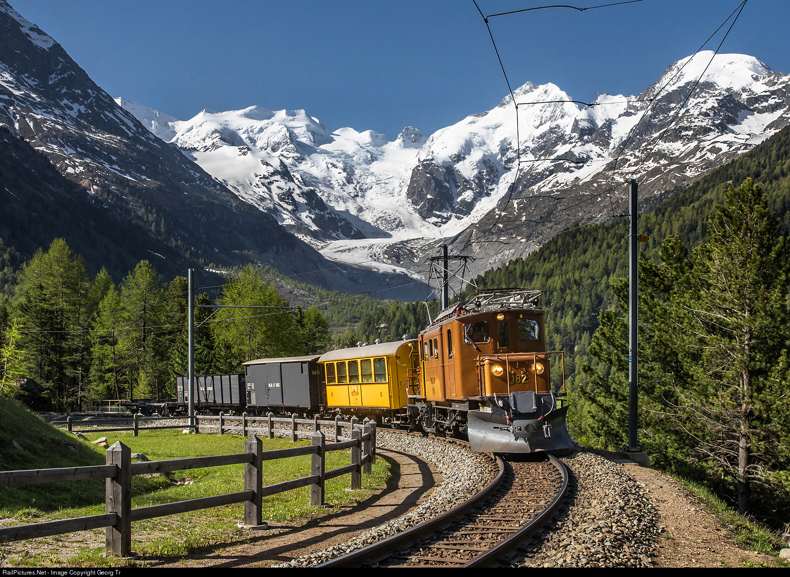 "Bernina Crocodile" Ge 4/4 # 182 of the RhB is rounding the Montebello curve near Morteratsch with a nice mixed passenger and freight train, during a privately organised RM photo charter. In the background from left Piz Bellavista, Argient, Crast'Agüzza, Bernina (4049 meter, highest mountain in Grisons, with the famous Bianco ridge on the right), Prievlus and Morteratsch.