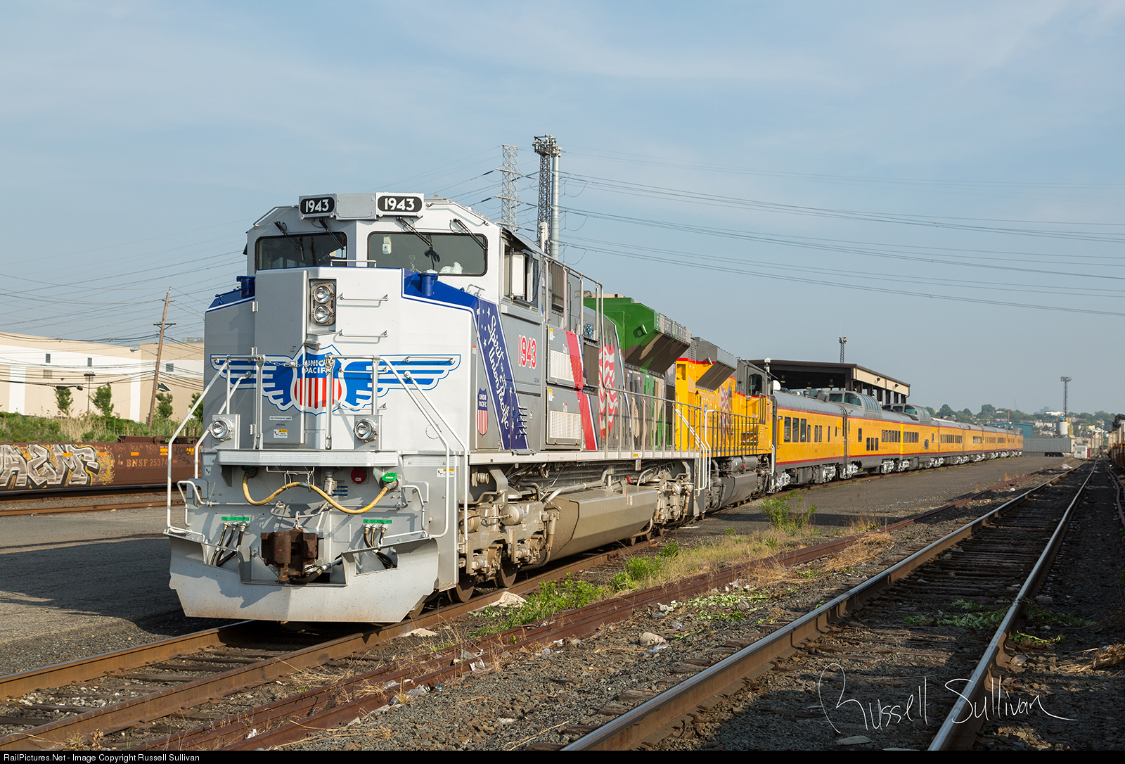 The Union Pacific Office Car Special sits tied down next to the shop track in Croxton Yard in Jersey City on Friday June 1, 2018.