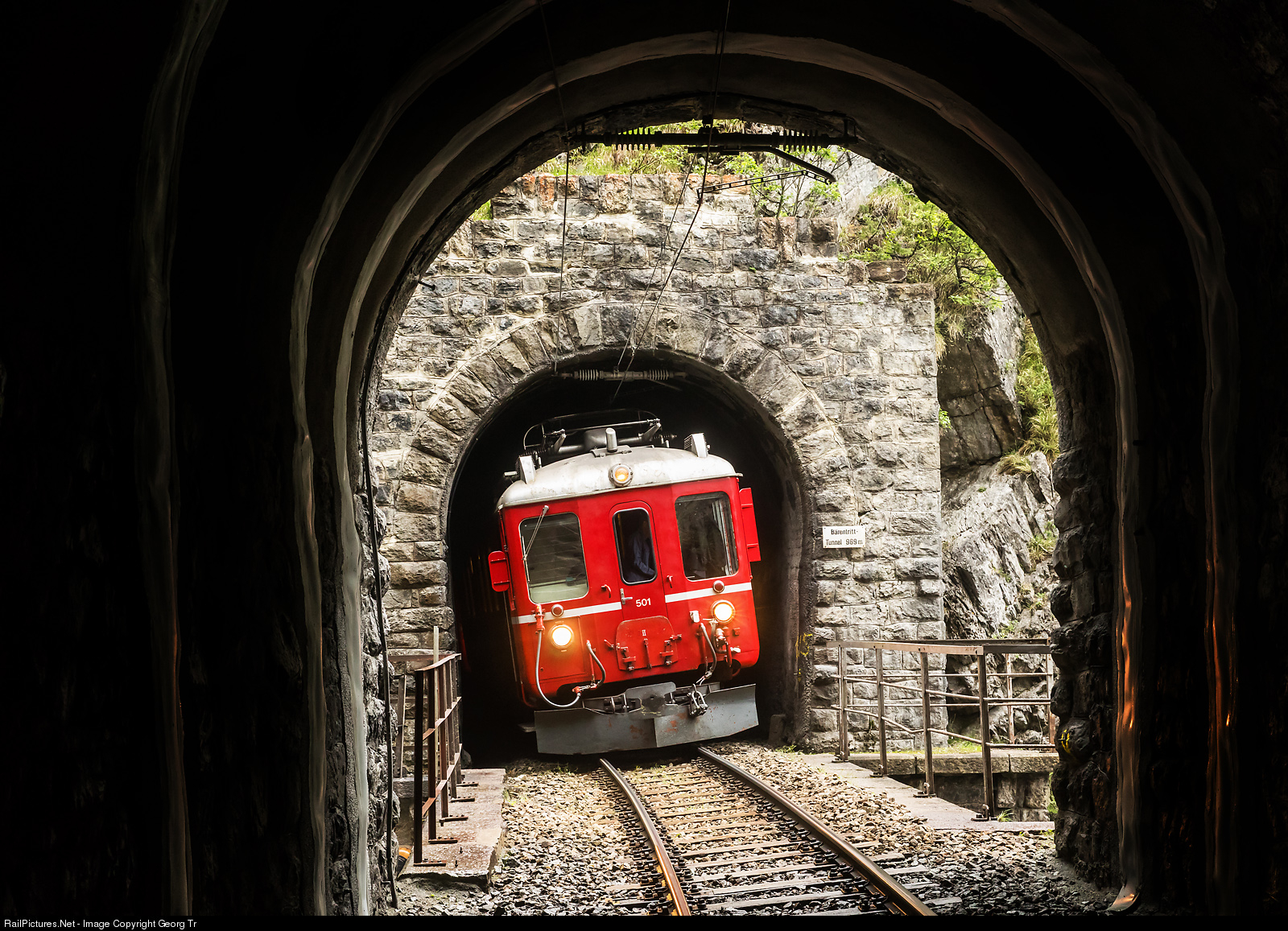 There is a gap of about 15 meters only between the 969 meter long Bärentritt tunnel and the 450 meter long Wiesen I tunnel in the Zügen gorge. A short bridge over the Brüggentobel creek (waterfall) is between the tunnels. Railcar ABe 4/4 # 501 of the RhB from 1939 stopped for the participants of a privately organised RM photo charter train.