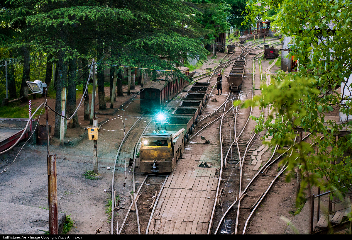 | The K10 loco is leading an empty train to the manganese mine. Manganese ore is the main product of the small city Chiatura lost in the gorge of the Kvirila river. The poor quality of the contact of the current collector with the overhead line causes a strong sparking. |