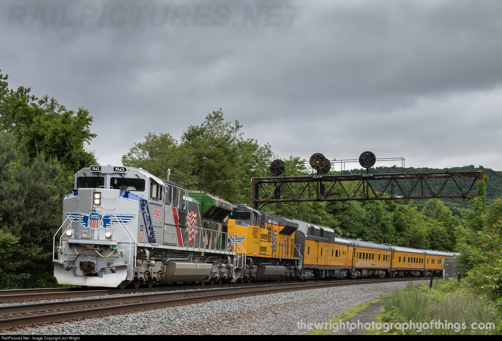Norfolk Southern had a very special visitor to their rails this week as the Union Pacific Business Train made it's way thru Pennsylvania on Thursday to New Jersey for a special function. The last time this occurred was in 1996 for the Democratic Convention in Philly. I won't get into the technical aspects but NS installed their internal signaling system into the lead engines to make this possible. Leading the way was a one of a kind painted locomotive. Designed by Veterans and recognizes all branches of the US Military and is known as "The Spirit of the Union Pacific."
