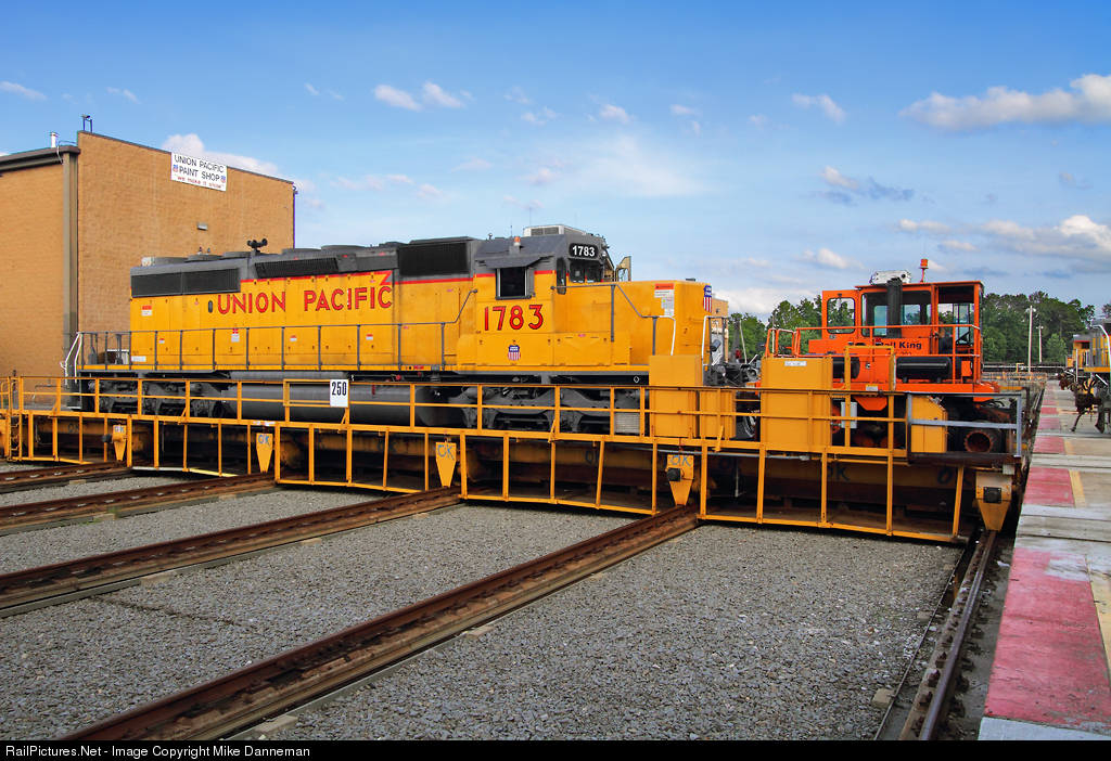 A recently rebuilt Union Pacific SD40N No. 1783 rides the transfer table at the railroad’s Downing B. Jenks Shop in North Little Rock, Arkansas, on May 19, 2015. The former EMD SD40-2 has gone through an extensive rebuild program and is being moved by a Rail King RK 300 mobile railcar mover (trackmobile) that is used to move locomotives around the shop.